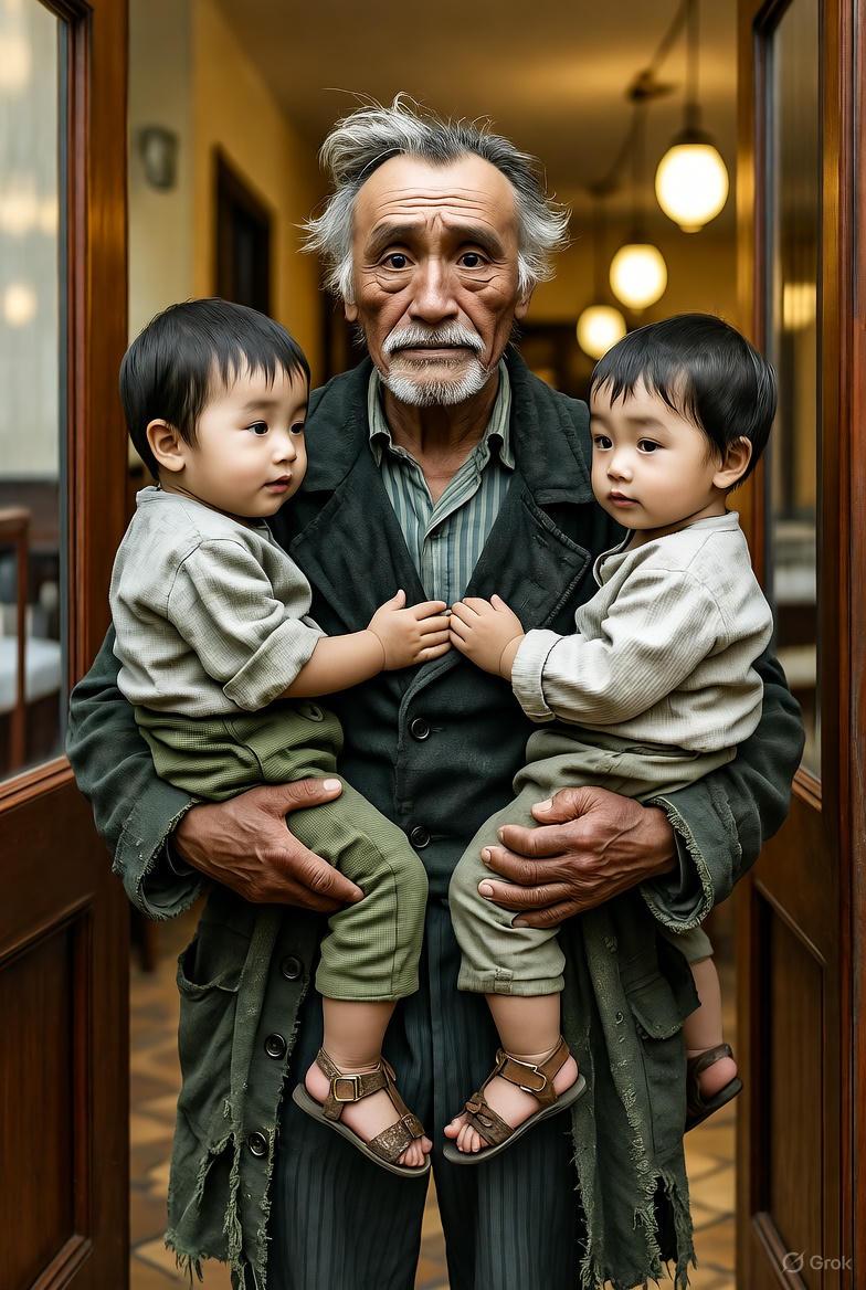 Era completamente bagnato, i capelli incollati alla fronte, il cappotto strappato in più punti, le scarpe spaiate e infangate. Il viso, coperto di polvere e pioggia, lasciava intravedere solo gli occhi: stanchi, profondi, segnati da una vita troppo dura. Sul petto, stretti da una fascia improvvisata, dormivano due neonati. Le loro guance erano pallide, gli occhi semichiusi, come se la fame avesse sostituito il pianto.
